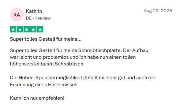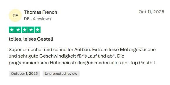 Der Tisch fährt weich, die Motoren sind kaum zu hören und selbst bei voller Höhe und schwerem Setup bleibt die Platte ruhig. Man vergisst nach kurzer Zeit, dass hier Technik arbeitet.